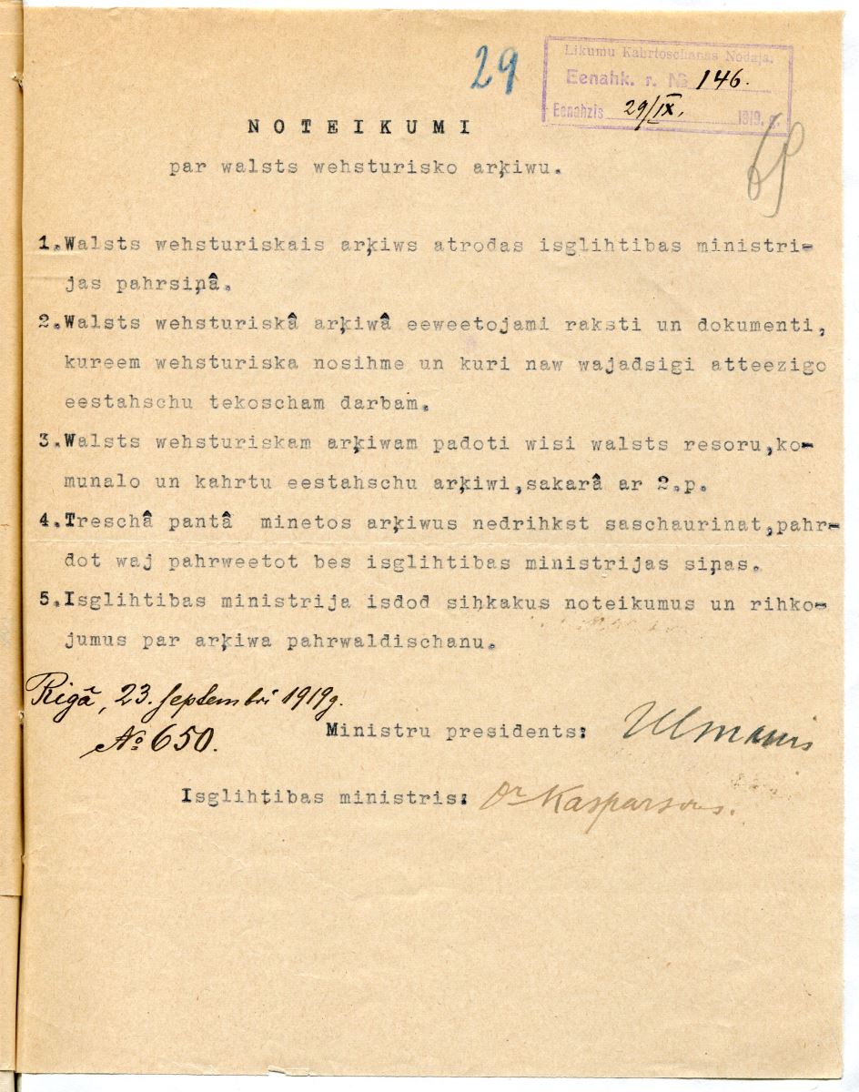 23.09.1919. Latvijas Republikas Ministru kabinets pieņem Noteikumus par Valsts Vēsturisko arhīvu. Tas ir pirmais normatīvais akts, kas reglamentē arhīvu darbību Latvijas Republikā.